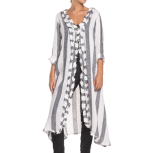 The Dorotea Jacket is a versatile pull-on for warmth and style. It features chic vertical stripes and a frayed neckline that elegantly cascades down to its hem. Whether it’s worn to your next ladies’ lunch or office gathering, the Dorotea Jacket offers a sophisticated blend of fashion and function sure to have you turning heads everywhere you go.